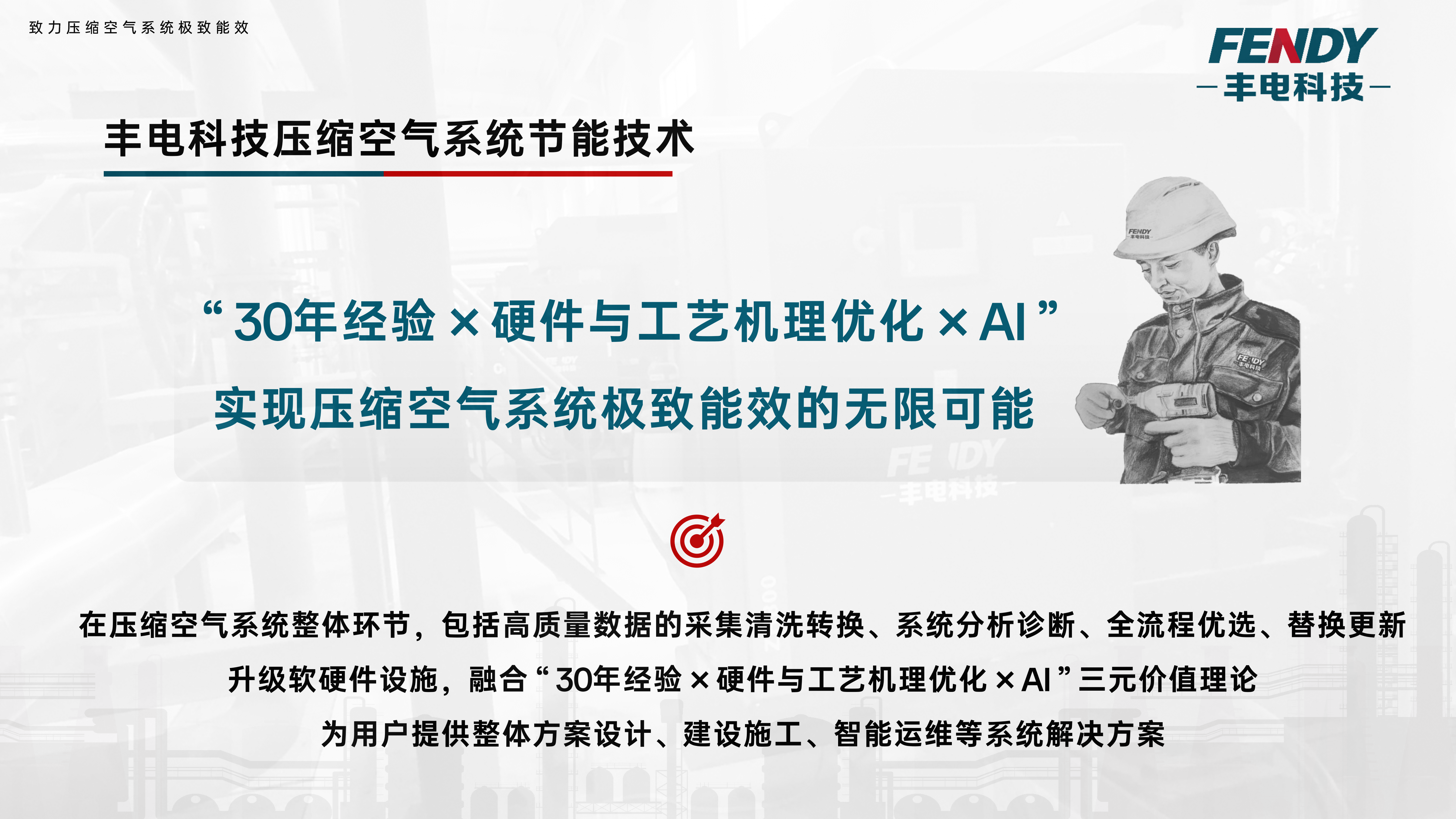 在工業(yè)節(jié)能降碳的主戰(zhàn)場(chǎng)上,壓縮空氣系統(tǒng)因其應(yīng)用廣泛、能耗占比高,成為重點(diǎn)攻堅(jiān)領(lǐng)域。然而,工業(yè)節(jié)能絕非簡(jiǎn)單的設(shè)備更替,而是一個(gè)涉及工藝、機(jī)理、運(yùn)營(yíng)的復(fù)雜系統(tǒng)性問題。破解這一難題的“秘訣”,在于對(duì)節(jié)能場(chǎng)景的深刻理解與AI技術(shù)的精準(zhǔn)落地。豐電科技提出的?“30年經(jīng)驗(yàn) × 硬件與工藝機(jī)理優(yōu)化 × AI” 三元價(jià)值理論體系,正是對(duì)這一深層需求的系統(tǒng)性回應(yīng)。該體系的價(jià)值并非三者的簡(jiǎn)單疊加,而是通過深度融合,構(gòu)建了一個(gè)從“經(jīng)驗(yàn)積淀”到“智能決策”再到“精準(zhǔn)執(zhí)行”的完整閉環(huán)。