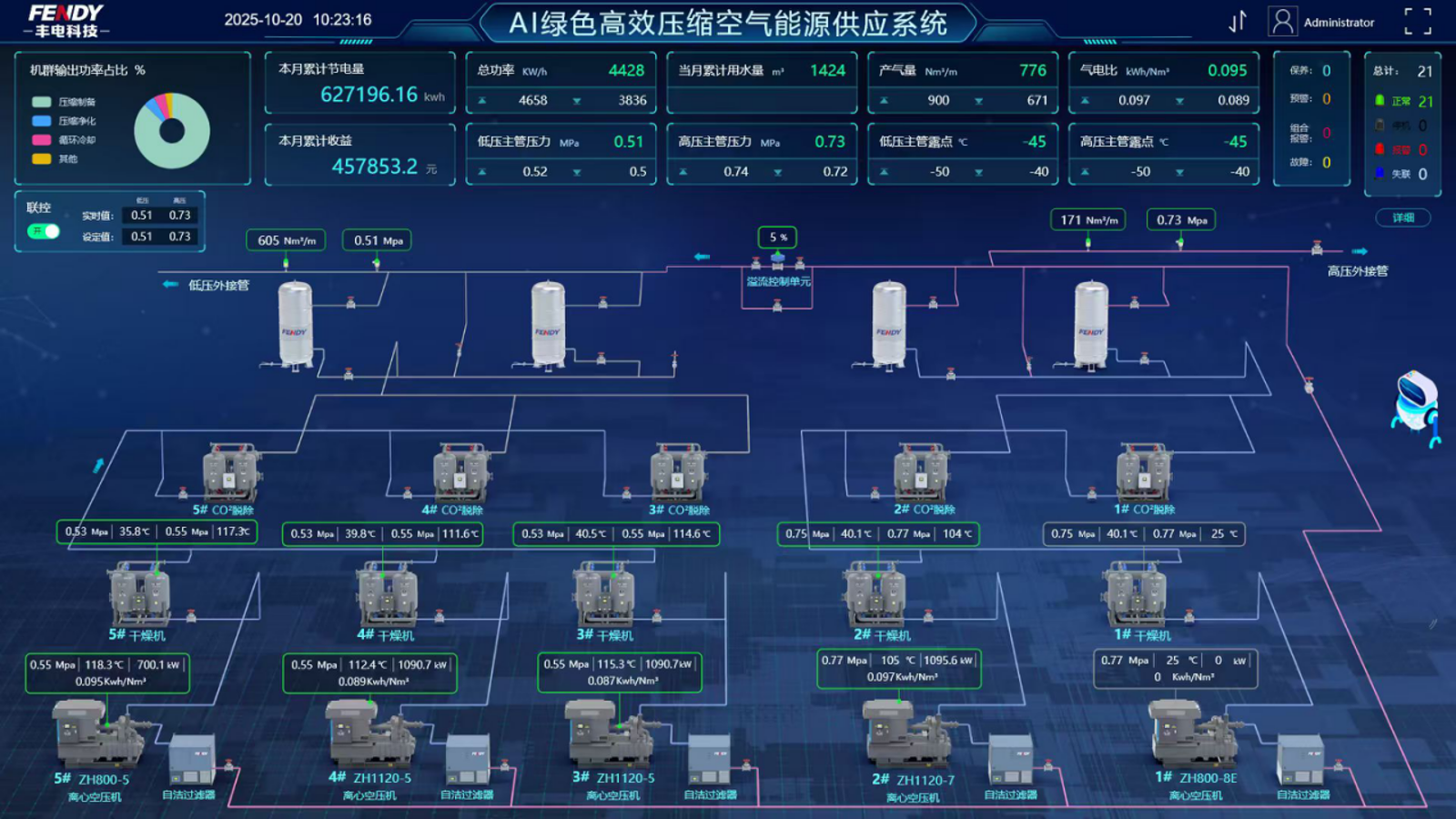 這一理論體系的具體實(shí)踐,集中體現(xiàn)在豐電科技自主研發(fā)的“工業(yè)云腦”系統(tǒng)中。作為AI智能體的核心載體,“工業(yè)云腦”實(shí)現(xiàn)了對(duì)壓縮空氣系統(tǒng)從產(chǎn)氣、輸氣、用氣到管理的全鏈路智能協(xié)同。它能夠敏銳感知產(chǎn)線負(fù)荷的細(xì)微變化,通過動(dòng)態(tài)供需匹配與實(shí)時(shí)優(yōu)化調(diào)控,將能耗降至物理極限。同時(shí),系統(tǒng)在設(shè)備預(yù)測(cè)性維護(hù)、安全生產(chǎn)風(fēng)險(xiǎn)預(yù)警等方面的應(yīng)用,真正推動(dòng)了AI技術(shù)與制造核心環(huán)節(jié)的深度融合。